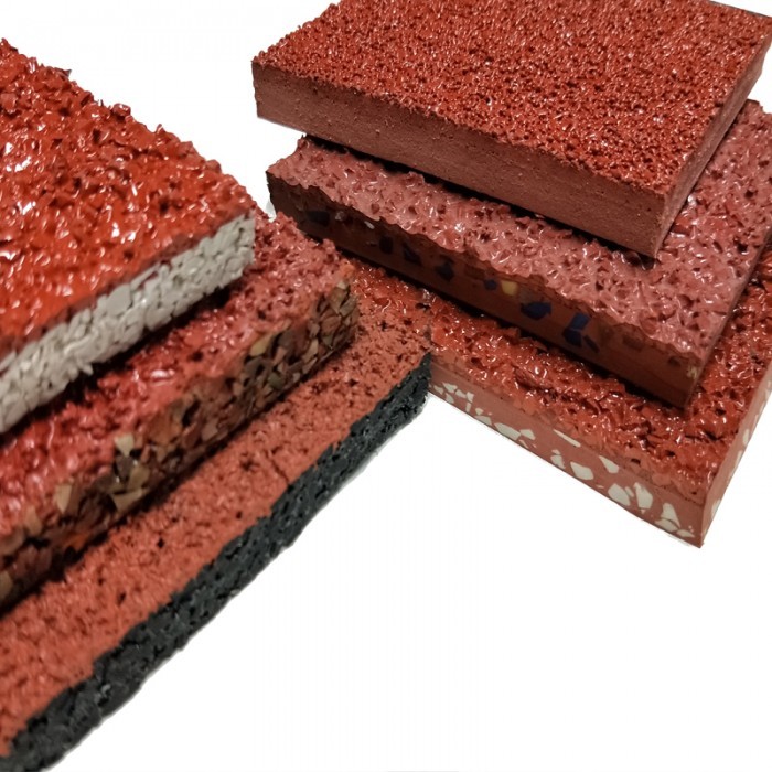 Souvent appelé système sandwich, ce système hybride offre une surface non poreuse de niveau élite à un prix compétitif. Cette surface est construite en trois couches : Une couche de base composée de granulés SBR noirs liés avec un liant polyuréthane, une couche d'étanchéité en polyuréthane et une couche de finition en polyuréthane associée à un enduit de surface EPDM. Comme ce type de surface est imperméable à l’eau, il dépend de la couche d’étanchéité pour maintenir la surface de roulement exempte d’eau de surface.
